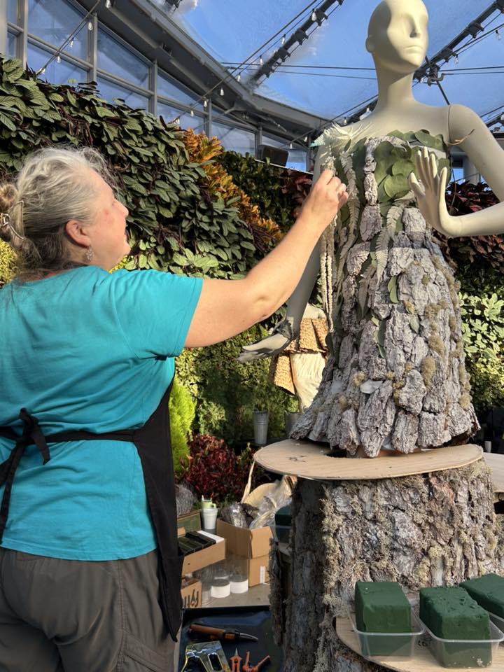 Moisey envisioned the base of the mannequin’s dress would be created using bark, frest eucalyptus leaves and preserved ferns. Each of the women were given a piece of corrugated cardboard, bark chips, peat moss and glue. They set to work immediately. Once completed, they delivered the finished pieces to Moisey who had already constructed the wooden piece to which the bark and moss-covered cardboard would be attached.