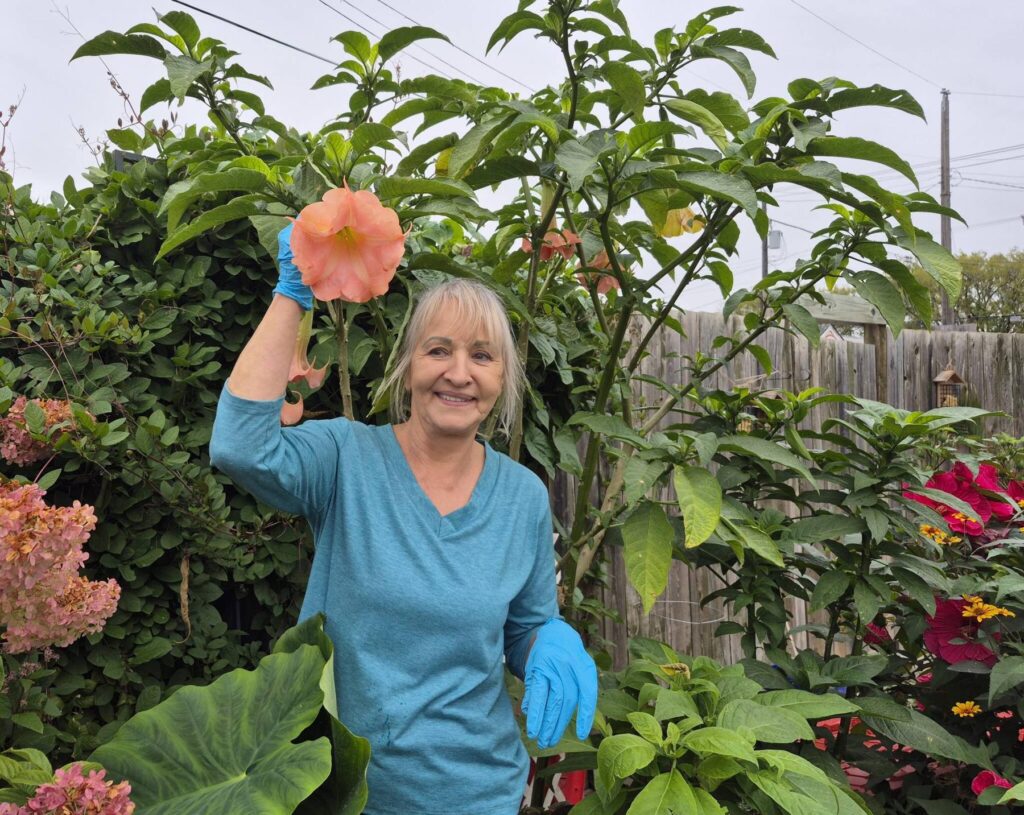 When Elizabeth Ochnio decided to become a member of the East Kildonan Garden Club in January, she couldn’t have imagined the new connections she would make. Nor could she have foreseen the attention that her small urban garden would attract from individuals and other garden clubs. “I feel amazing,” says Ochnio. “I’ve always gardened for myself, but now people come nearly every second day, and I love showing my garden.” July is a popular month for garden tours in Manitoba because flowering plants are in their prime. But in Ochnio’s backyard, the flower show starts in spring with an abundance of allium, builds in intensity throughout the summer and reaches a crescendo of beauty in September. If mild conditions continue, Ochnio’s remarkable garden will continue to bloom well into October. Members of the Brandon Garden Club were the first group to visit this summer when they travelled by chartered bus to a select number of Winnipeg gardens. On July 24, for the first time, Ochnio entered her garden in the East Kildonan Garden Club’s annual garden competition which has been organized for the past 15 years by EKGC member Teresa Lopata. Then, Renata Cook, president of EKGC, who knew of Ochnio’s skill in overwintering exotic tropical plants and growing plants from seed, invited Ochnio to participate in a pop-up garden tour hosted by EKGC on Aug. 15. “It was a paradise in mid-August,” says Cook, “but now in September it is even more amazing. As word spread about Ochnio’s garden, the West Kildonan Garden Club hosted a pop-up garden tour there on Sept. 13. Ed Amman, one of the many visitors to Ochnio’s garden in recent weeks, was blown away. “She is so entertaining to listen to,” says Amman.